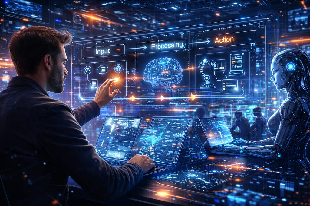 हर AI एजेंट तीन मुख्य चरणों में काम करता है — इनपुट, प्रोसेसिंग और एक्शन।