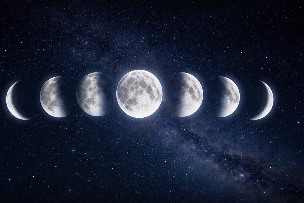 चांद के मुख्य चरण होते हैं — अमावस्या, शुक्ल पक्ष, पूर्णिमा और कृष्ण पक्ष।