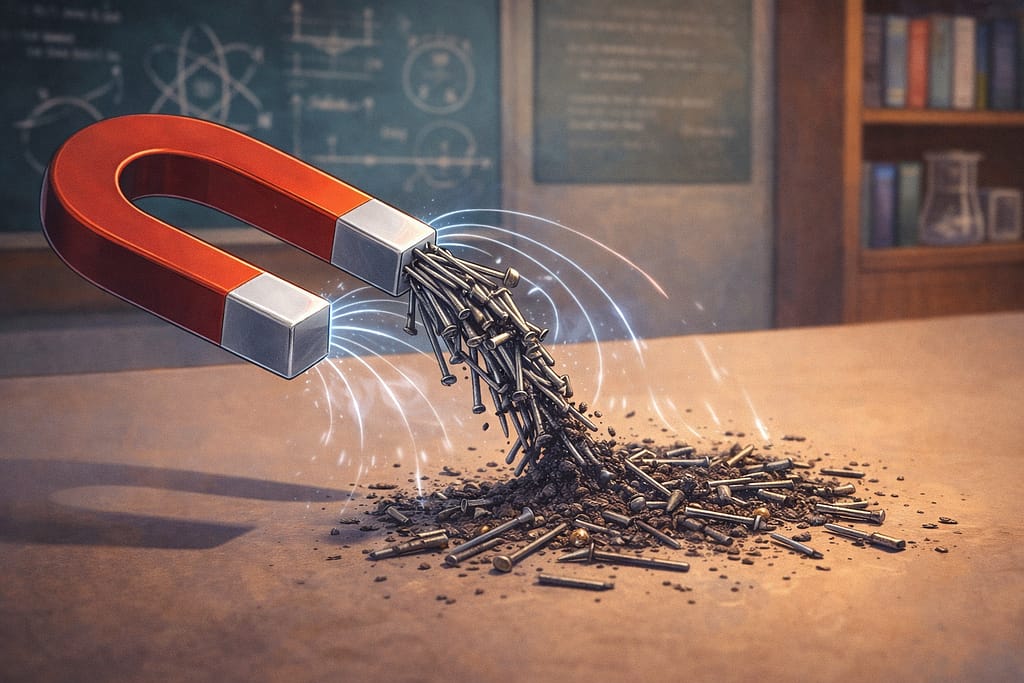 अक्सर हम देखते हैं कि चुंबक बिना किसी चीज़ को छुए लोहे के टुकड़ों को अपनी ओर खींच लेता है। यह दृश्य सामान्य लग सकता है, लेकिन इसके पीछे विज्ञान का एक अत्यंत रोचक सिद्धांत काम करता है।