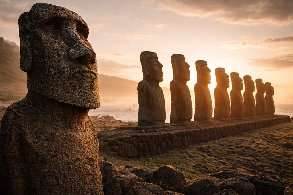 यहाँ खड़े हैं लगभग 900 विशाल पत्थर के चेहरे — जिन्हें “मोआई” कहा जाता है।