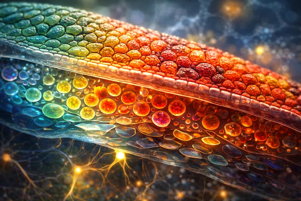 इन कोशिकाओं के नीचे और भी गहरी परतें होती हैं जो प्रकाश को अलग-अलग तरीके से परावर्तित करती हैं।