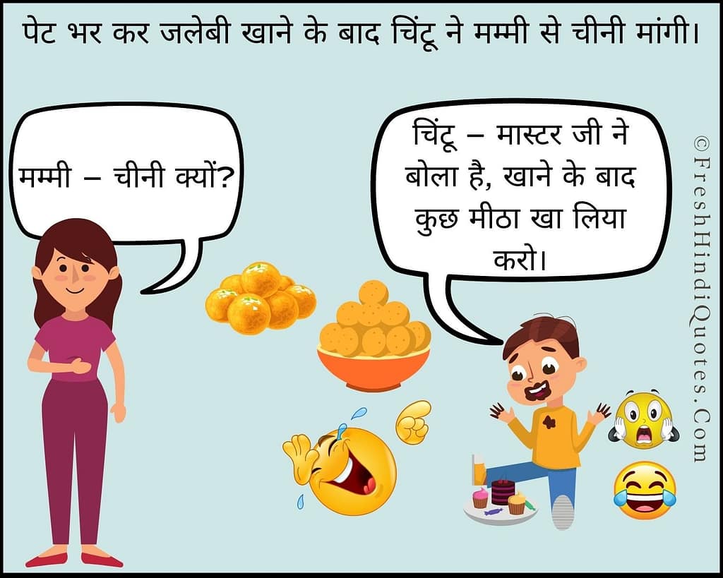 पेट भर कर जलेबी खाने के बाद चिंटू ने मम्मी से चीनी मांगी।