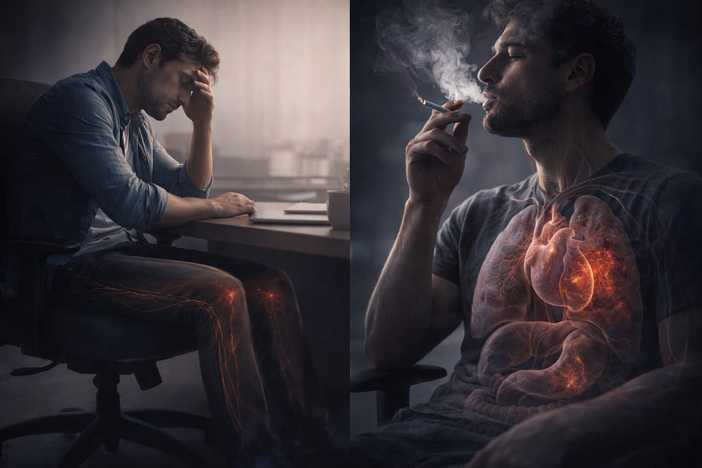 लंबे समय तक बैठना उसी तरह त्वरित विषाक्त प्रभाव नहीं डालता, लेकिन यह धीरे-धीरे मेटाबोलिक और हृदय जोखिम बढ़ाता है।